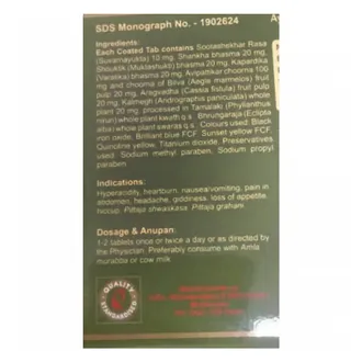 Additionally, Pittashekhar Rasa acts as a liver stimulant, fostering optimal liver health through detoxification and metabolism support. This formulation is beneficial in preventing gastric ulcers by balancing pitta and promoting Sama Pittan Pachan. It’s a suitable choice for those experiencing conditions like Jeerna Malavibandha, Amlapitta, heartburn, nausea, vomiting, abdominal pain, loss of appetite, hiccups, and more. Get relief from digestive discomfort and improve overall well-being with this tablet.